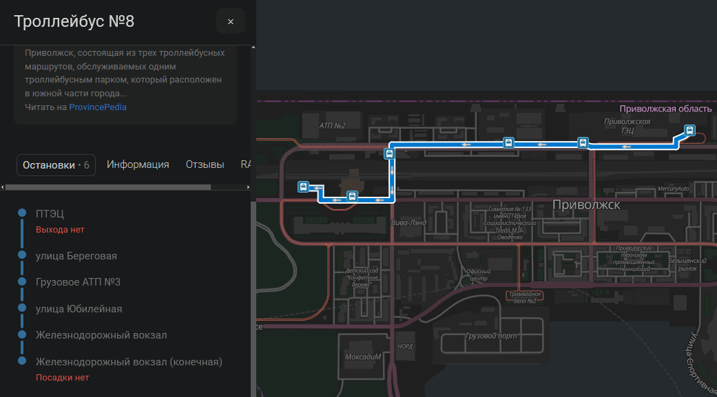Добавлено отображение списка остановок/станций в информации о маршруте. Список содержит остановки только для одного выбранного рейса/варианта (маршруты в БД разделены, по крайней мере, на два варианта: рейс «туда» и рейс «обратно» — прим.)