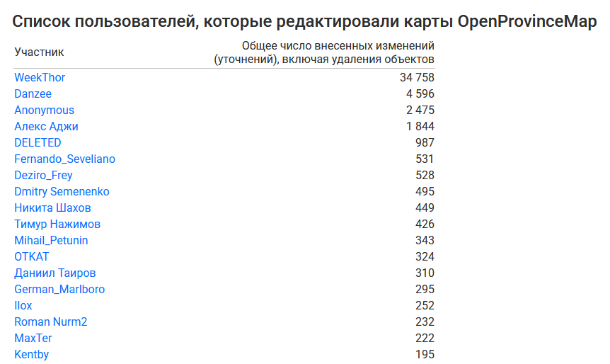 Впрочем, это не какой-либо рейтинг среди пользователей и не должно восприниматься таким образом — OpenProvinceMap благодарен любому пользователю, улучшающему сайт, даже если его вклад «минимален». На странице статистики отображаются ВСЕ пользователи, которые когда-либо вносили хотя бы одно изменение в данных карты