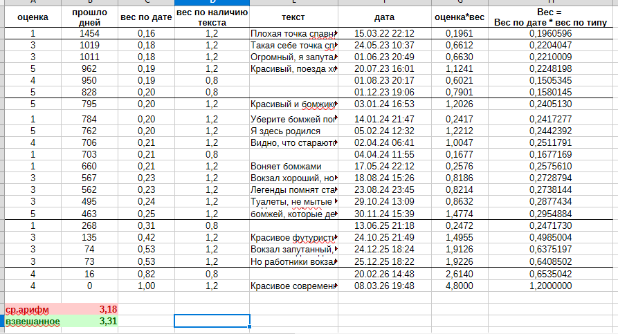 Средняя оценка по старому алгоритму получается 3.18, а по новому — 3.31. Два последних отзыва на «4 звезды» имеют больше веса, чем остальные, т.к. опубликованы позже всех и считаются более актуальными, а отзывы, опубликованные 3 месяца назад — вдвое меньший вес.