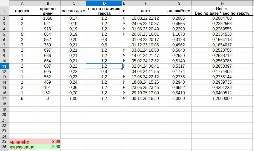 Но разница между вычисленными оценками невелика. Для того, чтобы разница была более заметна, придется представить другую картину: изначально имеем 16 негативных отзывов (пару из них пусть будут положительными), но все они опубликованы в 2022-2025 годах: