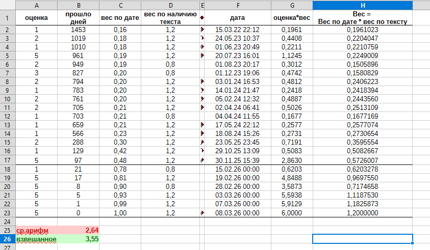 Это позволяет быстрее реагировать на новые отзывы: свежие отзывы имеют больше веса, чем отзывы, оставленные пару лет назад. Однако вес Wi практически перестает меняться уже спустя полгода-год. То есть отзывы 2024 и 2023 года имеют практически одинаковый вес